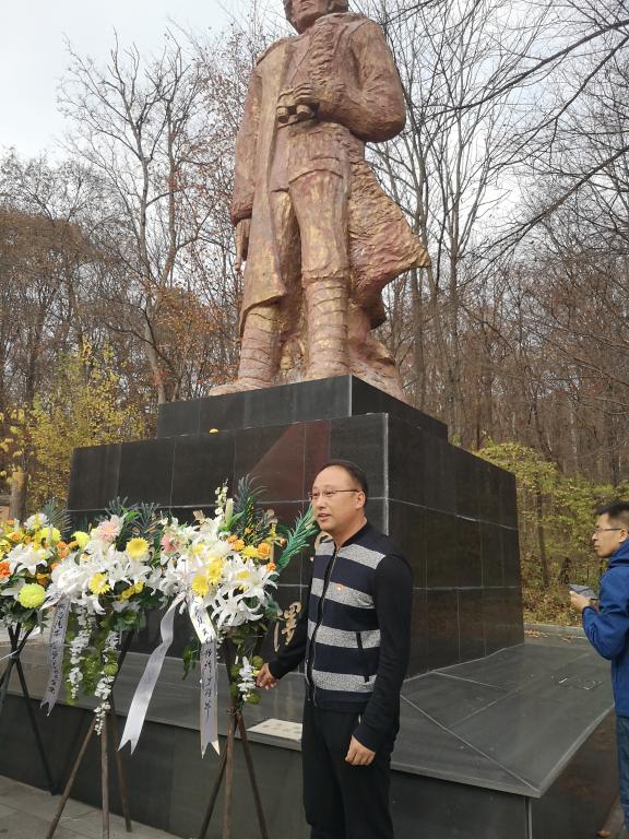 第一项:党总支副书记王博向杨靖宇将军塑像献花篮。